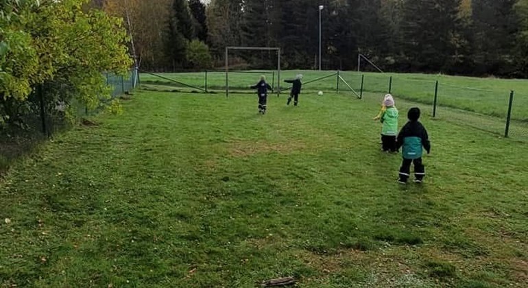 Vi är ute minst en gång per dag men gärna mer. Vi har en stor gård med gung- och klätterställningar vilka passar både de yngre och de äldre barnen, sandlåda, lekstuga, fotbollsplan, cyklar och massa mer. Vi har även en stor kulle som vi använder både pulkaåkning och vattenrutschbana, allt efter årstid.